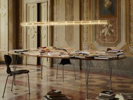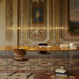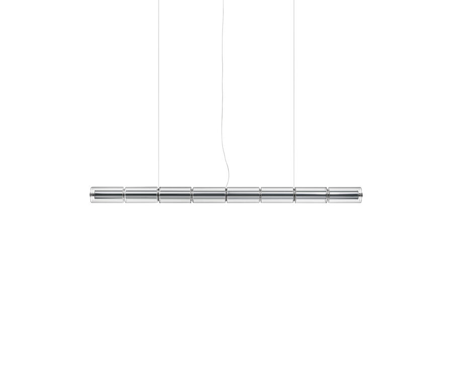 Suspension modulaire émettant une lumière diffuse. Corps horizontal en aluminium extrudé poli avec deux rubans LED pour un éclairage vers le haut et vers le bas. Variateur tactile intégré pour contrôler indépendamment l'intensité lumineuse. Corps recouvert dune série de cylindres en verre borosilicate délimités par des séparateurs traditionnels. Peut être installée en plusieurs rangées parallèles.