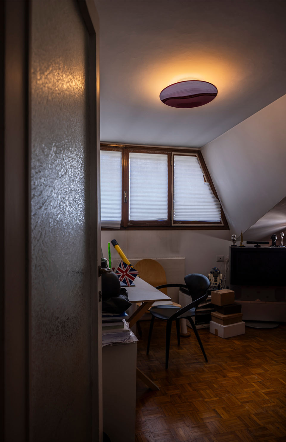 Design. Gabriele et Oscar Buratti Dimensions : Ø 48 x h 9,8 cm Matériau : Aluminium brossé laqué et PMMA lampe plafonnier